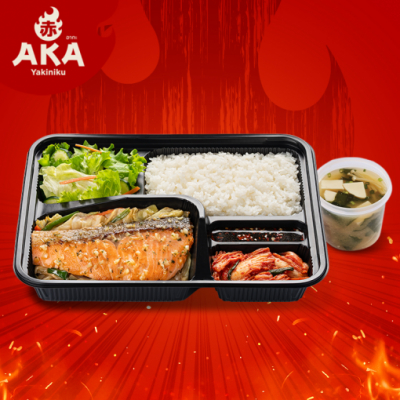 ชุดแซลมอนเนยกระเทียม เสิร์ฟพร้อม ข้าวญี่ปุ่น ซุปมิโสะ สลัด และกิมจิ