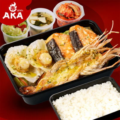 ชุดซีฟู้ดรวมเนยกระเทียม เสิร์ฟพร้อม ข้าวญี่ปุ่น ซุปมิโสะ สลัด และกิมจิ