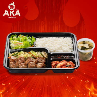 ชุดเนื้อลูกเต๋า เสิร์ฟพร้อม ข้าวญี่ปุ่น ซุปมิโสะ สลัด และกิมจิ