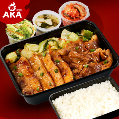 ชุดหมูยากินิกุ เสิร์ฟพร้อม ข้าวญี่ปุ่น ซุปมิโสะ สลัด และ กิมจิ