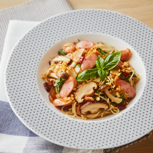 คาเปลินี่ไส้กรอกอาราบิกิผัดพริกกระเทียม